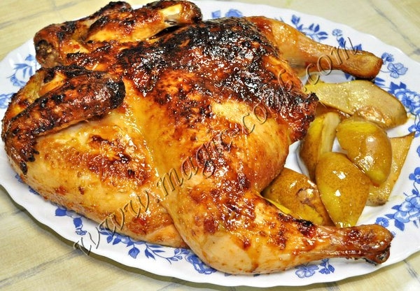 1 курица 4-5 зубчиков чеснока соль смесь перцев Курицу разрезать вдоль по грудке, но не разрезая до конца. Посолить и поперчить свежемолотой смесью перцев. Приподнять шкурку, либо сделать проколы, и нашпиговать курицу чесноком. Поместить курицу в глубокую посуду. Маринад 3 стол. ложки остро-сладкого соуса чили 1 стол. ложка гранатового концентрата "Наршараб" щепотка ягод (шишки) можжевельника молотого щепотка семян фенхеля щепотка зры (кумин) 0,5 ч. ложечки куркумы 1 стол. ложка коричневого сахара соль смесь перцев *** 3 груши 1 стол. ложка мёда В чашку налить остро-сладкий соус чили и гранатовый концентрат "Наршараб". Добавить свежемолотые семена кумина и фенхеля. Ягоды (шишки) можжевельника измельчить в ступке и щепотку молотого можжевельника всыпать в маринад. Добавить куркуму и коричневый сахар. Посолить и поперчить свежемолотой смесью перцев. Маринад хорошенько перемешать. Обмазать маринадом курицу. Посуду с курицей закрыть крышкой или накрыть пленкой и поставить в холодильник мариноваться на несколько часов. Форму для запекания смазать оливковым маслом. Выложить в форму груши, порезанные на дольки. Курицу достать из маринада, поместить в форму к грушам и полить ее остатками маринада. Курицу с грушами поставить в заранее нагретую до 180 град. духовку. Во время запекания не забывать поливать курицу маслом. А также в процессе запекания температуру в духовке можно убавить до 170 град. За десять минут до готовности достать курочку из духовки и смазать ее мёдом. Затем снова вернуть курочку в духовку.