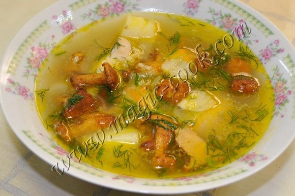 0,5 кг. свежих лисичек 0,5 кг. куриных крылышек 2 крупных картофеля 1 луковица 1 морковь 3 стол. ложки пшена 2 лавровых листочка ~ 50 гр. сливочного масла соль смесь перцев укроп