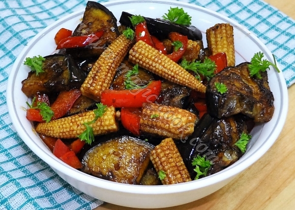 650 гр. баклажанов 1 банка консервированной мини кукурузы в початках 410 гр. (baby corn) 1 болгарский перец 1 стручок перца чили соль петрушка