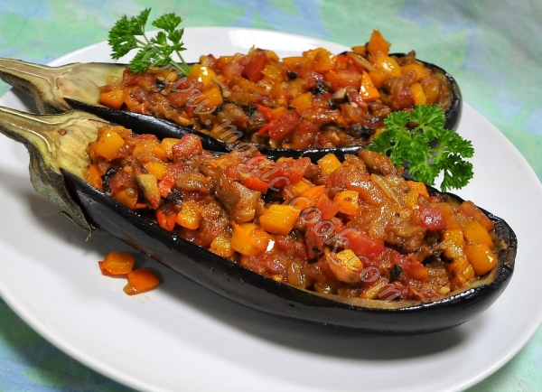 Выложить в форму начиненные "лодочки" баклажанов. Сверху сбрызнуть оливковым маслом.