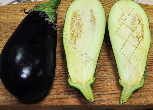 Баклажаны вымыть и вместе с плодоножкой разрезать каждый баклажан вдоль на две половинки.