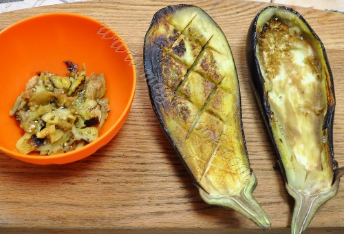 После того, как половинки баклажан немного остынут, аккуратно извлечь ложкой или ножом мякоть и измельчить её.