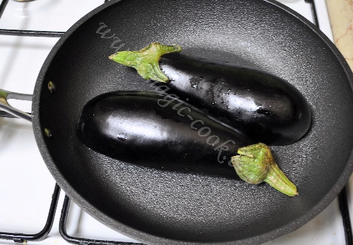 Баклажаны обжарить на сухой сковороде на среднем огне около 5 минут.