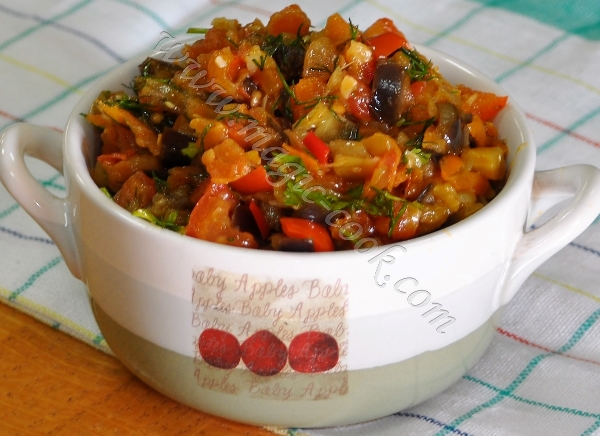 0,5 кг. баклажан 1 молодой кабачок (250 гр.) 500 гр. помидоров 1 большая луковица 1 морковь 1 болгарский перец 3-4 зубчика чеснока 1/2 стручка перца чили оливковое масло ~1 стол. ложка сахара соль смесь перцев укроп, кинза