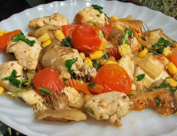 1 куриная грудка 200 гр. лесных грибов (маслята замороженные) 1 луковица 1 морковь 1 болгарский перец 1 зубчик чеснока 8-10 помидорок-шерри 100 гр. кукурузы консервированной 1 стол. ложка меда щепотка зры (кумин) щепотка кориандра 1 лавровый листочек соль смесь перцев кинза Грибы разморозить и поджарить в глубокой сковороде на оливковом масле. Куриную грудку нарезать на небольшие кусочки. Добавить мясо к грибам и поджарить до золотистого цвета. Затем добавить в сковороду нашинкованную полукольцами луковицу и натертую морковь. Когда лук и морковь подрумянятся, добавить - - болгарский перец,нарезанный соломкой, - помидорки-шерри,порезанные пополам, - измельченный зубчик чеснока. Немного поджарить,помешивая. Добавить консервированную кукурузу, мед и лавровый листочек. Всыпать свежемолотые кумин и кориандр. Посолить и поперчить свежемолотой смесью перцев. Убрать до минимума огонь и продолжить тушение до готовности. Готовое блюдо посыпать измельченной кинзой.