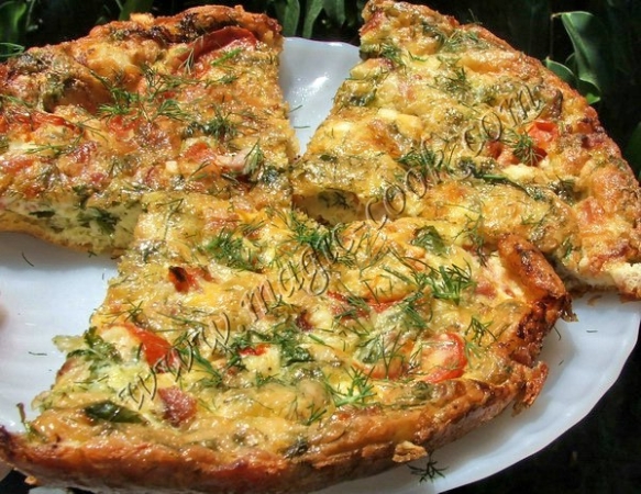50 гр. овечьего сыра "Фета" 20% жирности 150 гр. ветчины 50 гр сыра Голландского 1 яйцо вареное вкрутую 6 помидорок шерри 1 зубчик чеснока несколько веточек укропа несколько веточек кинзы соль по вкусу смесь перцев *** 5 яиц В емкости венчиком слегка взбить яйца. Добавить - - сваренное вкрутую и мелко порезанное одно яйцо, - сыр "Фета", вилочкой размятое. - сыр Голландский, натертый на терке, - ветчину, нарезанную мелкими кубиками, - помидорки шерри, порезанные на четыре части, - измельченный зубчик чеснока, - порезанную зелень укропа и кинзы. Посолить и поперчить свежемолотой смесью перцев. Всё хорошо размешать. В форму для запекания налить немного растительного масла. Влить яичную смесь. Поставить форму в разогретую до 175 град. духовку. Выпекать до зарумянивания.