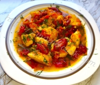Помидоры черри разрезать пополам и добавить в сковороду. Добавить измельченные зубчики чеснока. Перемешать и обжарить. Влить в сковороду теплую воду так, чтобы она была вровень с содержимым сковороды. Довести до кипения.