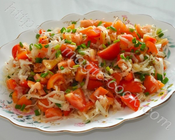 ~300 гр. кольраби ~200 гр. дайкона (китайская редька) 2 помидора 1 сладкий болгарский перец 2-3 зубчика чеснока зеленый лук