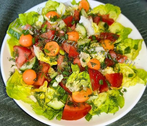 200 гр. листового салата латука 1 большой помидор 2 средних огурца 100 гр. физалиса зеленый лук укроп