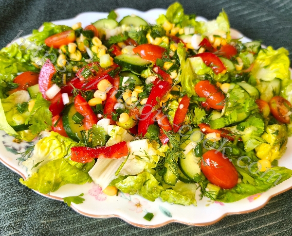 200 гр. листового салата латука 150 гр. помидоров черри 2 средних огурца 1 болгарский перец 1/2 банки сладкой консервированной кукурузы 2 зубчика чеснока зеленый лук укроп кинза