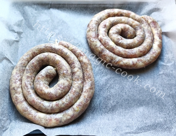 Включить мясорубку и постепенно наполнить кишку фаршем. В процессе наполнения кишки фаршем сворачивать её колечком.