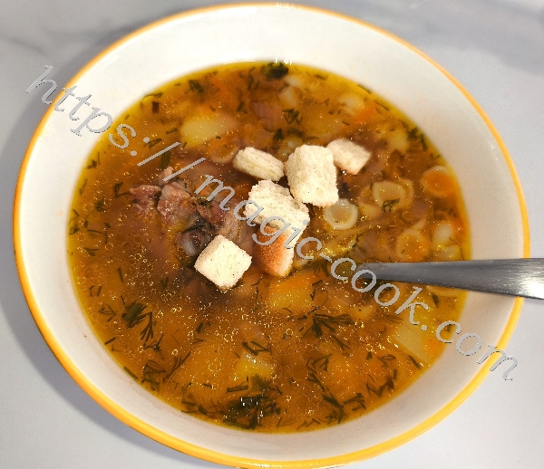 600 гр.свиных ребрышек 1 луковица 1 морковь 100 гр. пасты kонкильетте (conchigliette) - маленькие ракушки 2 картофелины 2 лавровых листочка соль смесь перцев укроп *** крутоны (сухарики)