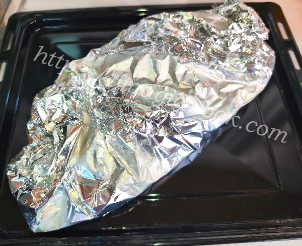Противень застелить фольгой, оставляя концы фольги свисать.