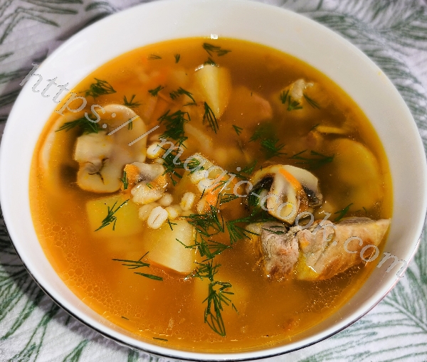 600 гр. свиного мяса 1 луковица 1 морковь 250 гр. шампиньонов 3 средние картофелины 80-90 гр. перловой крупы 2 лавровых листочка соль смесь перцев укроп